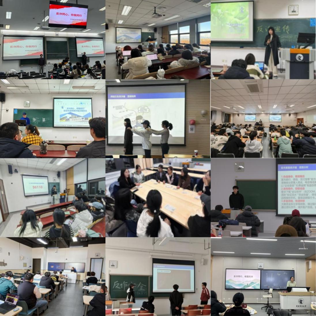 班级宣讲阶段,全校各学院积极响应,认真组织,各班主讲人以主题班会、趣味问答、身边人讲身边案等形式面向班级全体同学开展了内容丰富、形式多样的反诈宣讲。宣讲中,同学们不仅学习了专业的反诈知识,更通过案例解读、情景剧模拟、海龟汤推理游戏、反诈狼人杀、反诈视频配音等互动环节,在情景模拟中提升应对技巧,将防范要点内化于心,有效提升了自我防护的意识和能力,实现了反诈教育从“被动接受”到“主动参与”的转变。