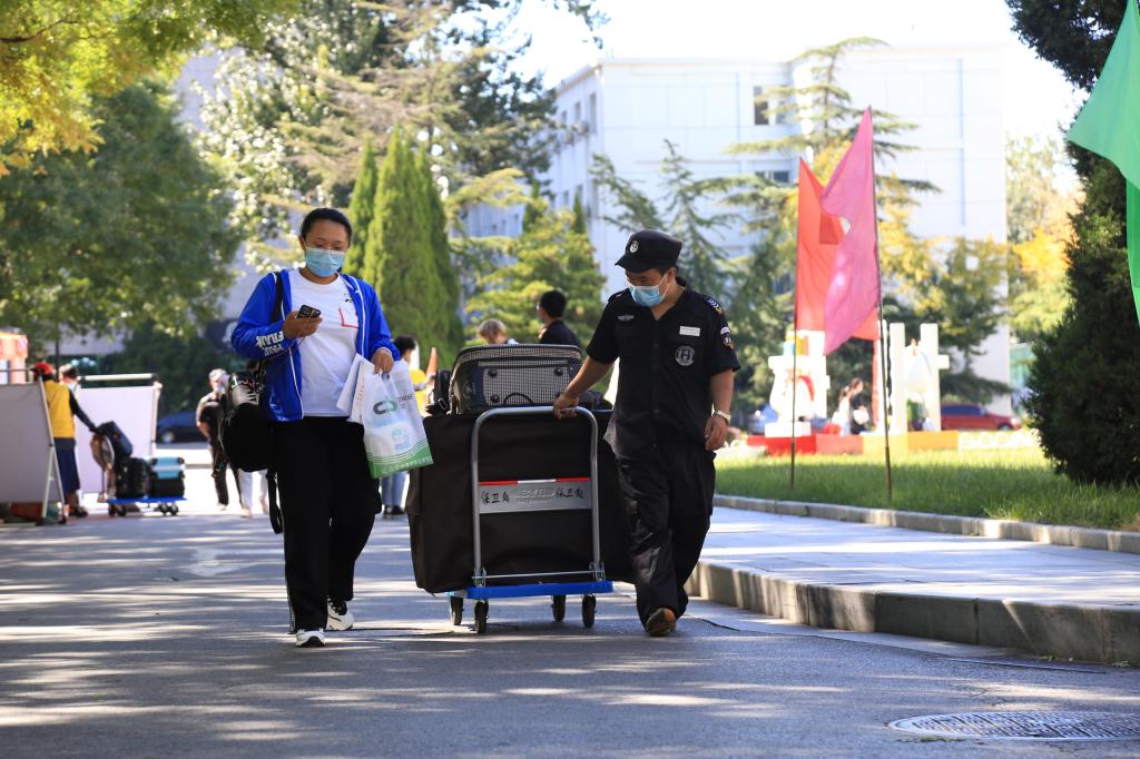 在学院报到后,保卫人员们把新生的行李搬到宿舍,他们因为行李过重直不起腰,从健步如飞到略微踉跄,但他们的背影足够宽阔,定能在未来生活中保护这一群可爱的孩子们。